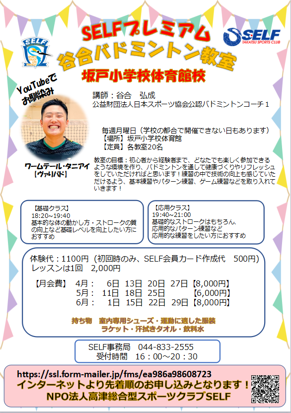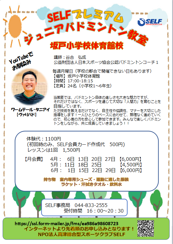 | 韓国語 基礎クラス (中学生以上) | ★バドミントン (高校生以上・親子参加) | |||||